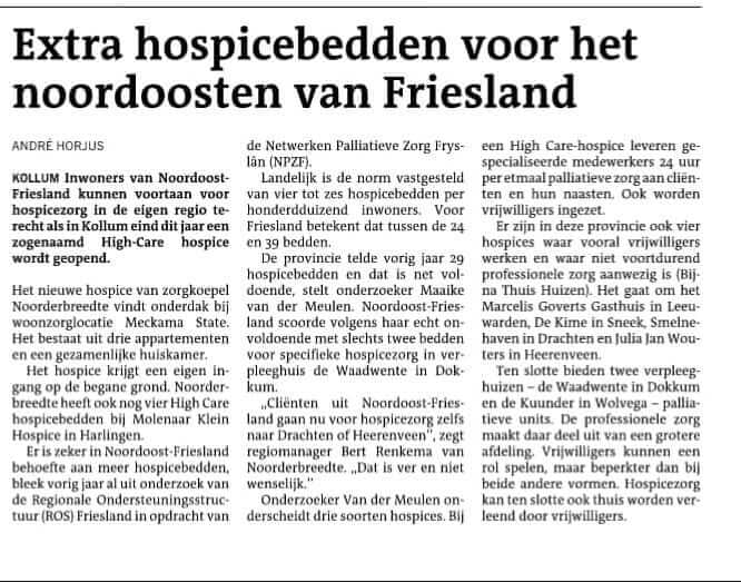 Inwoners van Noordoost-Friesland hoeven voortaan voor hospicezorg niet langer meer naar Drachten of Heerenveen, aangezien er in Kollum eind dit jaar een zogenaamd High-Care hospice wordt geopend!