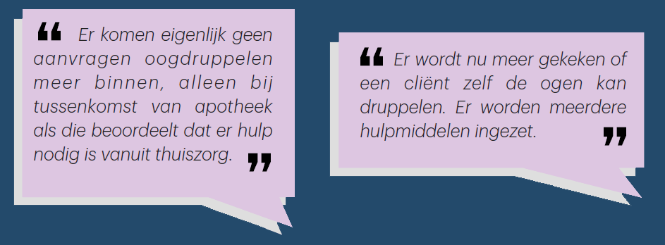 De cliënten kunnen vervolgens bij de apotheek advies vragen over een passend hulpmiddel ter ondersteuning van het druppelen, zoals een druppelbril, Eyot of Eyot Minim. Dit zorgt ervoor dat cliënten beter voorbereid zijn en sneller zelfstandig aan de slag kunnen zonder dat de wijkverpleging hoeft worden ingeschakeld. Het resultaat? Een daling in het aantal aanvragen bij de wijkverpleging voor hulp bij het druppelen van de ogen en een versterking van de zelfstandigheid van de cliënten.