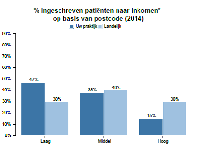 Ik kon beschikken over de Vektis Praktijkspiegel van de huisartsenpraktijk! Eén van de huisartsen had die gedownload van de Vektissite, waar hij overigens voor alle huisartsenpraktijken gereed staat. In die Praktijkspiegel is een grafiek opgenomen met een vergelijking naar inkomen van patiënten landelijk en van de eigen huisartsenpraktijk. U ziet het in de figuur hieronder. In de betreffende patiëntpopulatie was het gemiddelde inkomensniveau flink lager dan het landelijk gemiddelde. Nu zegt inkomen natuurlijk ook niet alles, maar er is vaak een correlatie met lage opleiding, lage gezondheidsvaardigheden, en laaggeletterdheid.