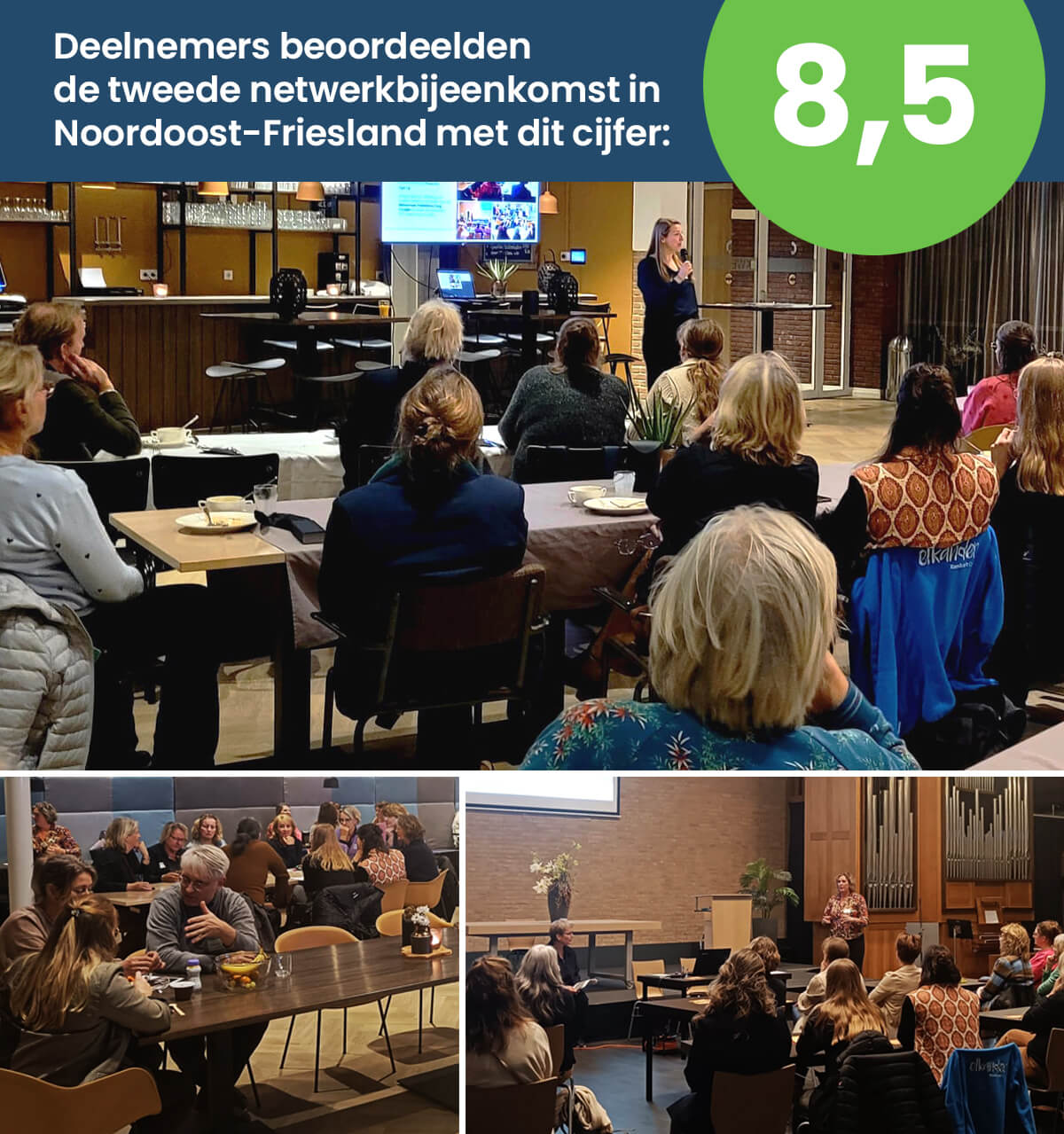‘Gisteravond vond de tweede netwerkbijeenkomst in Noordoost-Friesland plaats. Het was geweldig om te zien hoe deze direct de interactie bevorderde tussen de verschillende zorg- en ondersteuningsprofessionals uit de kernteams in de regio en tot acties leidde.’